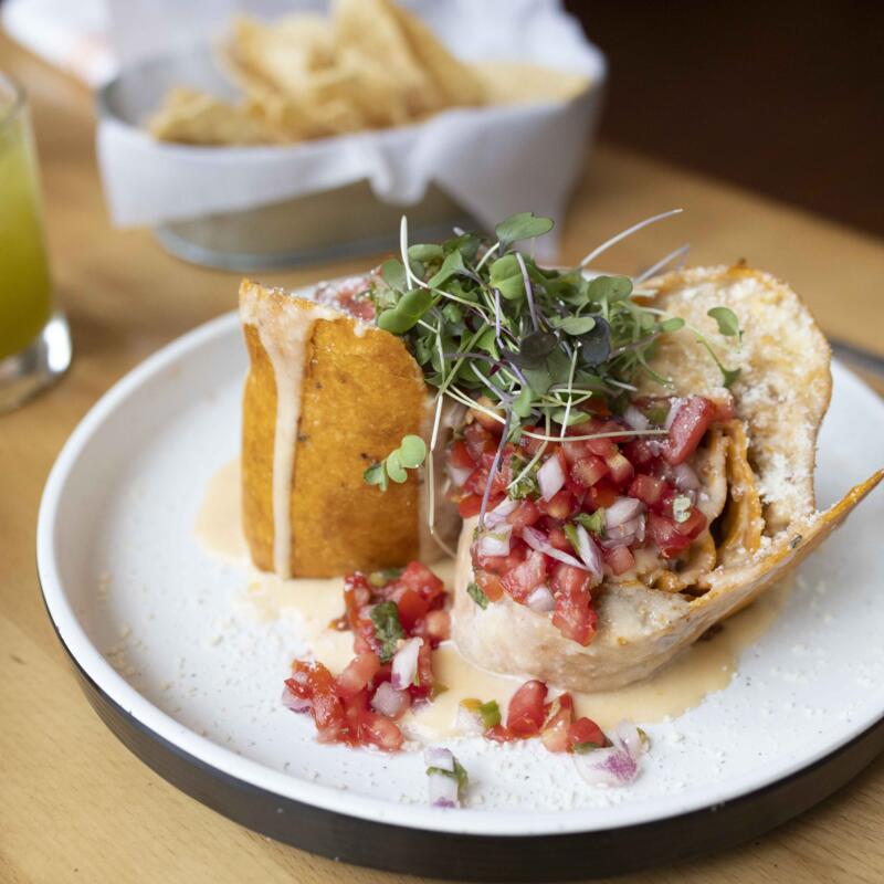 Monterey jack cheese, rice, black beans, pico de gallo, your choice of protein, rolled in a flour tortilla & fried. Served with jicama slaw over corn puree & cilantro-lime crema.